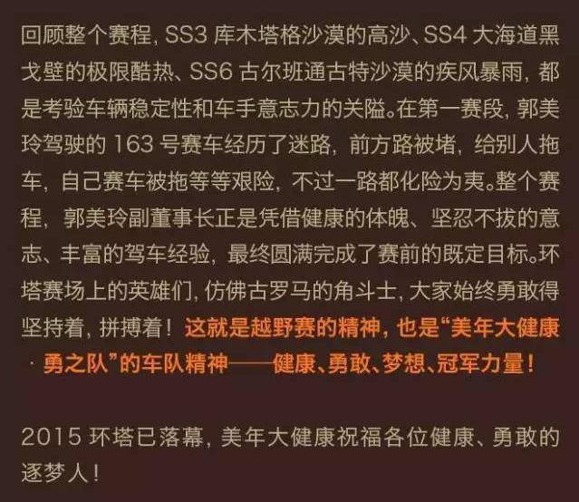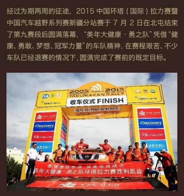 2015中國(guó)環(huán)塔(國(guó)際)拉力賽于7月2日在北屯結(jié)束了第九賽段后圓滿落幕。本屆環(huán)塔拉力賽共有143輛汽車參賽,經(jīng)過13天9個(gè)賽段的角逐,由世紀(jì)長(zhǎng)河集團(tuán)董事長(zhǎng)、美年大健康副董事長(zhǎng)郭美玲女士領(lǐng)銜參賽的“美年大健康•勇之隊(duì)”獲得汽車組全場(chǎng)21名的成績(jī),當(dāng)然也是女子車手最好成績(jī)(今年女賽車手比賽組有5位)。因?yàn)榻】担杂赂遥≈挥袚碛薪】档捏w魄,才能在人生旅途中勇敢前行,實(shí)現(xiàn)夢(mèng)想,成就自己的冠軍!