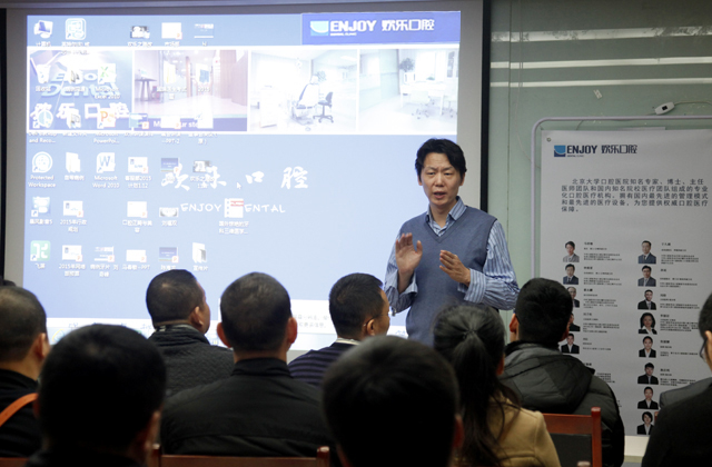 結束了對美年大健康體檢中心的參訪,郭美玲董事長帶領學員們來到了世紀長河集團投資經營的健康產業中的另一重地-歡樂口腔醫療連鎖,亞運村分院。歡樂口腔馬春敏院長熱情接待,并專門開設講座介紹口腔醫療行業的現狀、前景及歡樂口腔的發展。