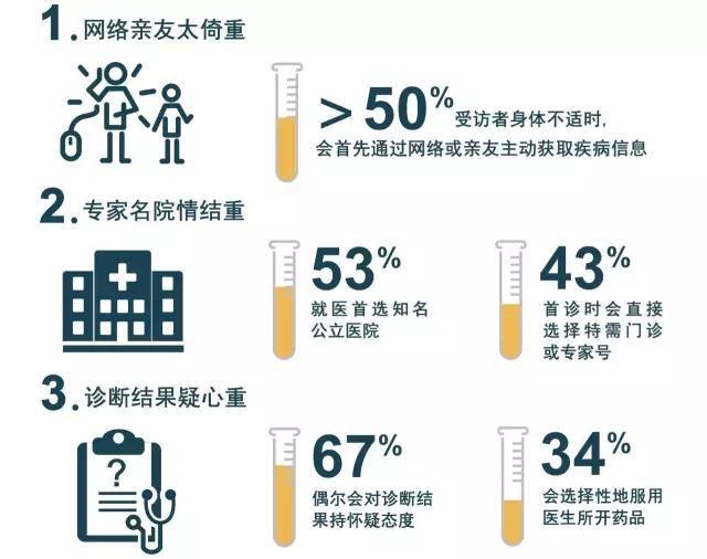 報告提示,在“六大問題”的基礎上,“三大情結”亦不容忽視。調研發現,由于可信賴的權威信息發布源不足,民眾過于倚重網絡與親友作為信息源;過于重視專家、知名醫院;不信任診斷結果。這一結果是否在一定程度上揭示了當前愈演愈烈的醫患矛盾的原因,值得引起重視。