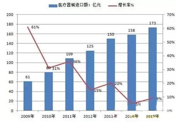 在以上四個行業發展的有利因素的影響下,2015年,我國醫療器械市場總體規模達到3080億元,比上一年增長524億元,年均增長率達20%。雖然我國醫療器械市場已成為繼美國和歐盟之后的世界第三大醫療器械市場,但是這也無法掩蓋我國在國際市場上相對競爭力較低的缺陷。