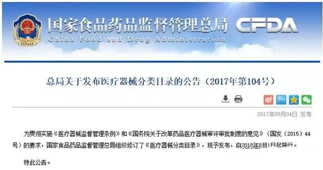 隨著醫療器械產業的快速發展,新技術、新產品的不斷涌現,醫療器械分類體系已難以適應產業發展和監管工作的需要。近日,國家食品藥品監督管理總局正式發布了最新修訂的《醫療器械分類目錄》,自2018年8月1日起施行。