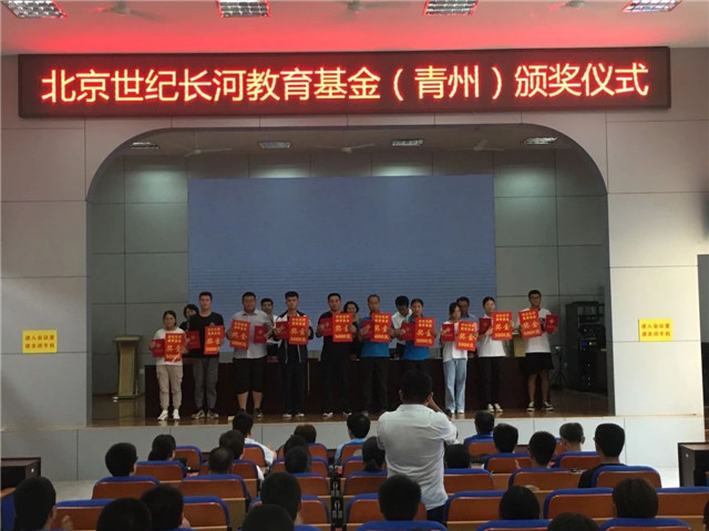 8月16日下午,“北京世紀長河教育基金(青州)”頒獎儀式在山東省青州市教體局舉行。頒獎儀式上,青州市10名高三優秀教師、10名高三優秀畢業生獲得每人5000元獎勵;20名貧困高三畢業生獲得每人5000元“圓夢”資助;60名學生獲得價值5000元的“世紀長河教育基金之壯志培養計劃”培養資格,即將開啟北大、清華名校研學之旅。北京世紀長河科技集團有限公司董事長郭美玲、總裁趙奇,青州市教體局領導郝炎磊、陳良瑞,北京世紀長河教育基金(青州)理事會理事長孫鼎梅出席儀式;青州市各高中校長、分管業務副校長以及受表彰的優秀教師、學生等共同參加了此次頒獎儀式。
