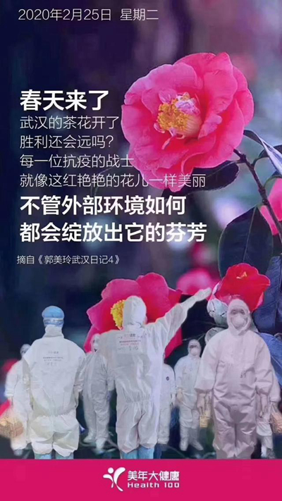 感悟:近日贊譽杳來,心生不安。美年健康身為一家預防醫療龍頭企業,自己身為經營者,疫情之下,帶隊來到武漢,本份內之事,責無旁貸。寵辱不驚,保持如如不動之心,更有助于做好團隊后盾。