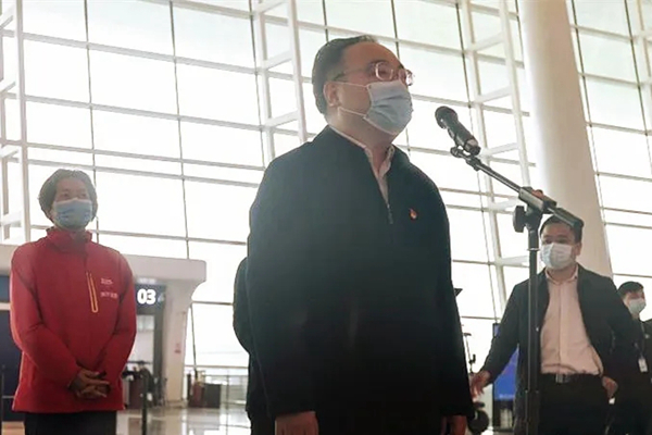 俞熔董事長(zhǎng)迎接抗疫英雄的隊(duì)伍,并向國(guó)家衛(wèi)健委、民航總局、武漢市人民政府、上海市衛(wèi)健委、上海市閔行區(qū)政府、以及虹橋機(jī)場(chǎng)、東方航空、錦江集團(tuán)等企事業(yè)單位致以最誠(chéng)摯的感謝。