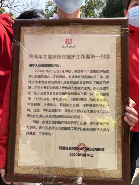 武漢市武昌區(qū)新冠肺炎疫情防控指揮部致美年健康援鄂醫(yī)療隊(duì)的一封信