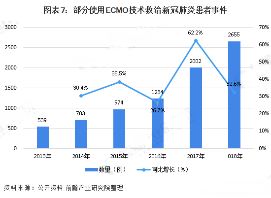 在心血管外科領域,ECMO有效性和接受度也在不斷提升。中國生物醫學工程學會體外循環分會發布數據,2013-2018年中國大陸及香港特區開展體外膜肺氧合(ECMO)輔助治療數量快速增長,2018年輔助治療數量達到2655例,同比增長30%以上。