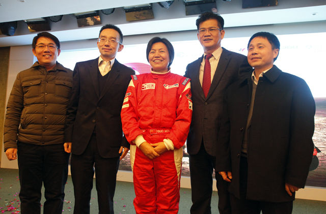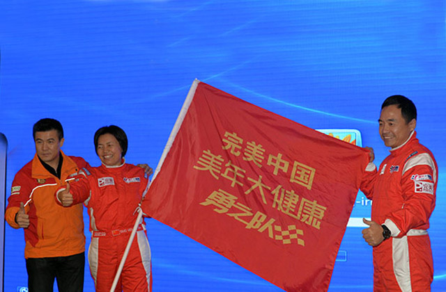2016 Dakar Rally will start the race on January 3. “Perfect China·Meinian Onehealth·Brave Team” is ready to start. Wang Xudong, the general manager of China Grand Rally Auto Racing Management Co., Ltd, the famous racing driver Zhou Yong, the navigator of “Perfect China·Meinian Onehealth·Brave Team”, Liao Min, attended the conference and held flag presentation. Zhou Yong presented the racing driver Guo Meiling and the pilot Liao Min from “Perfect China·Meinian Onehealth·Brave Team” with the flag.
