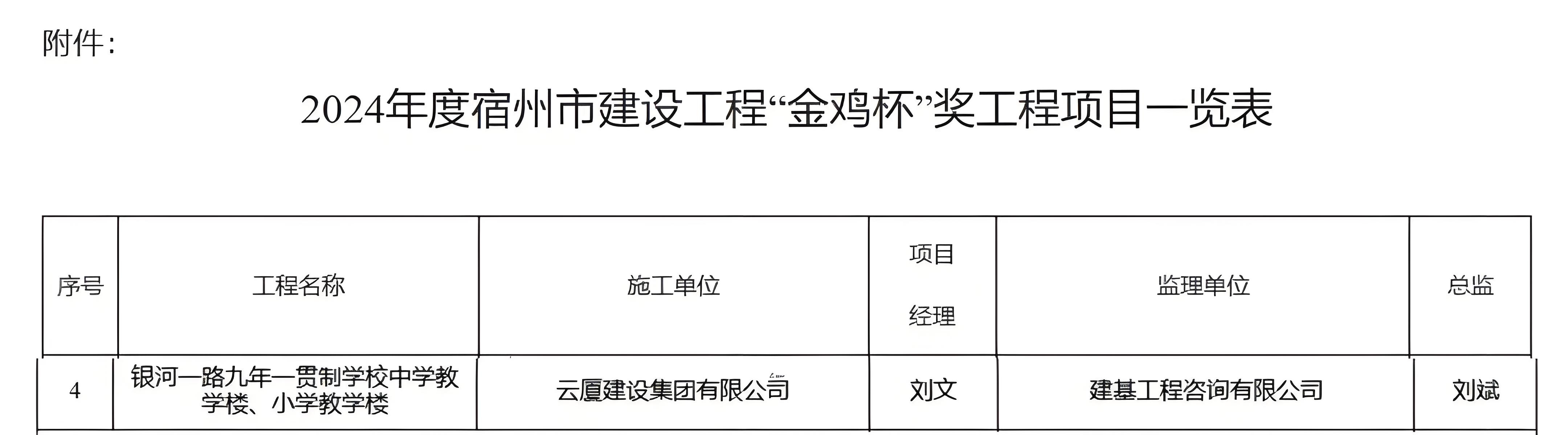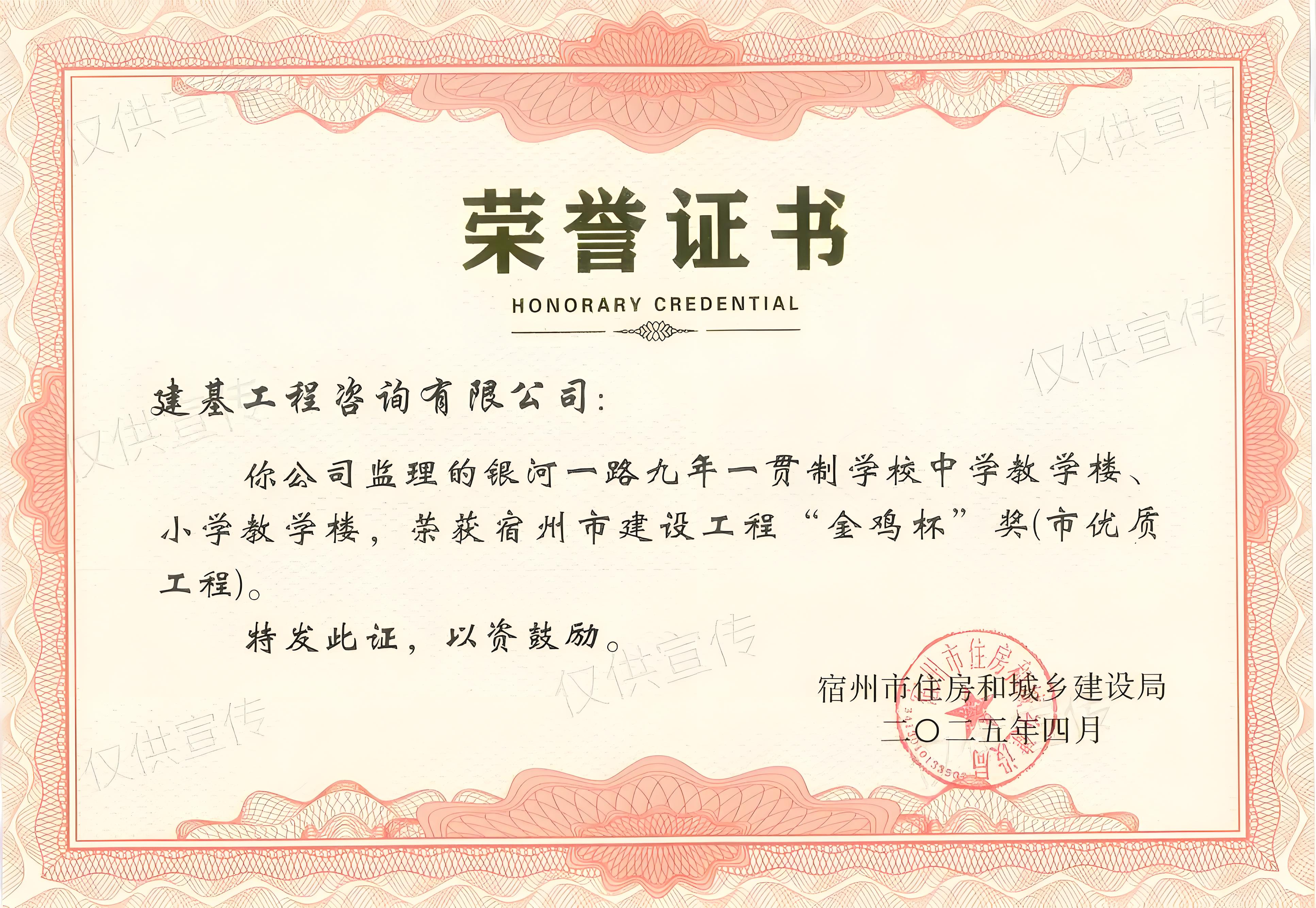 近日,由公司監(jiān)理的銀河一路九年一貫制學(xué)校中學(xué)教學(xué)樓、小學(xué)教學(xué)樓項目,榮獲2024年度宿州市建設(shè)工程"金雞杯"獎(市優(yōu)質(zhì)工程),項目總監(jiān)理工程師劉斌同志獲評"優(yōu)秀總監(jiān)理工程師"稱號。