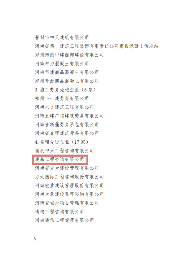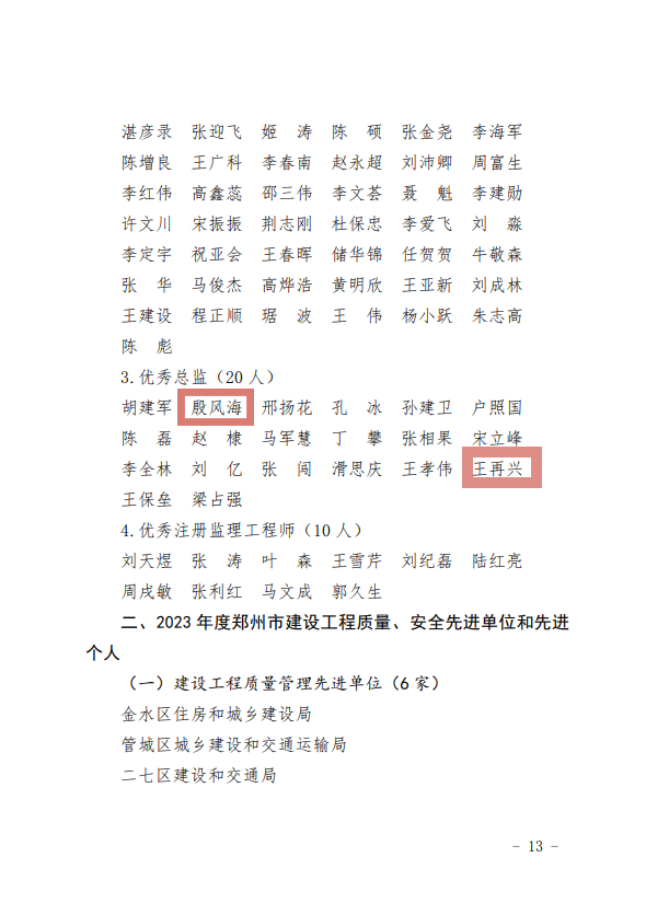 近日,鄭州市城鄉建設局發布了《鄭州市城鄉建設局關于表揚2023年度建設系統先進單位先進企業和先進個人名單的通報》,公司入選先進企業榜單,公司總監殷鳳海、王再興榮獲優秀總監榮譽稱號。