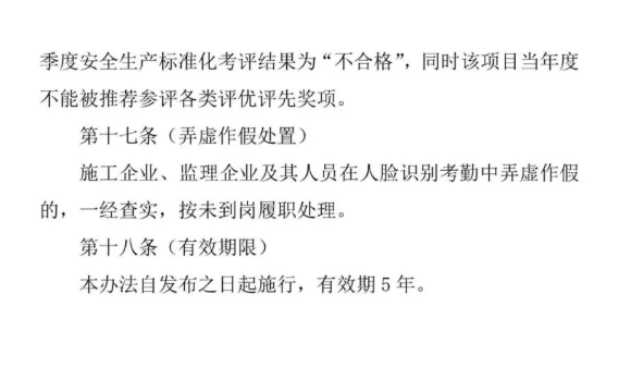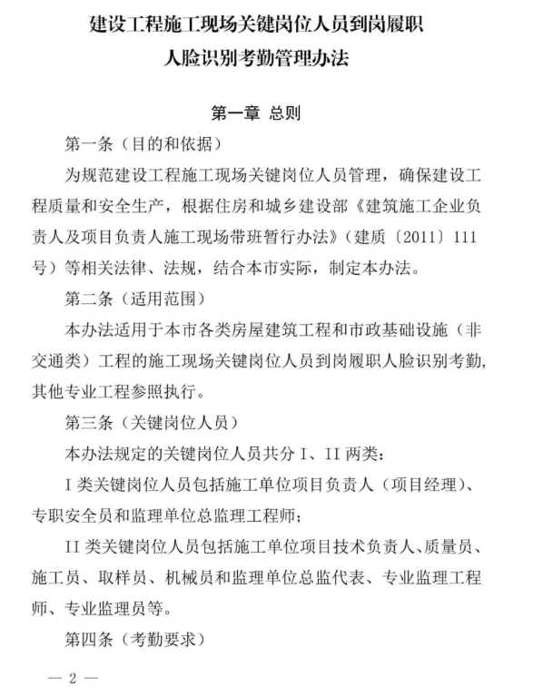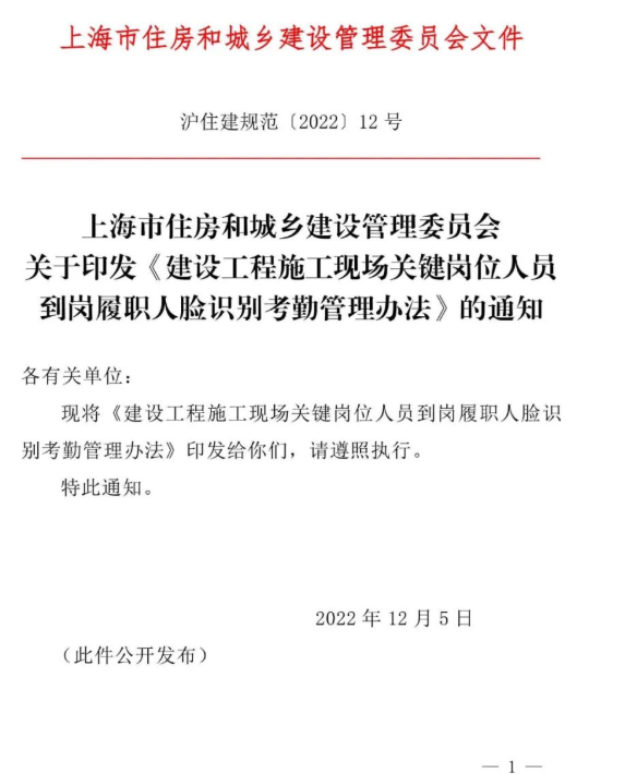 近日,上海市住建委印發《建設工程施工現場關鍵崗位人員到崗履職人臉識別考勤管理辦法》,自發布之日起施行。