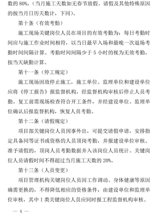 施工現場關鍵崗位人員考勤月到崗率不得低于當月施工天數的80%,(當月施工天數如無春節放假、請假及其他特殊原因的按當月日歷天數計,下同)。