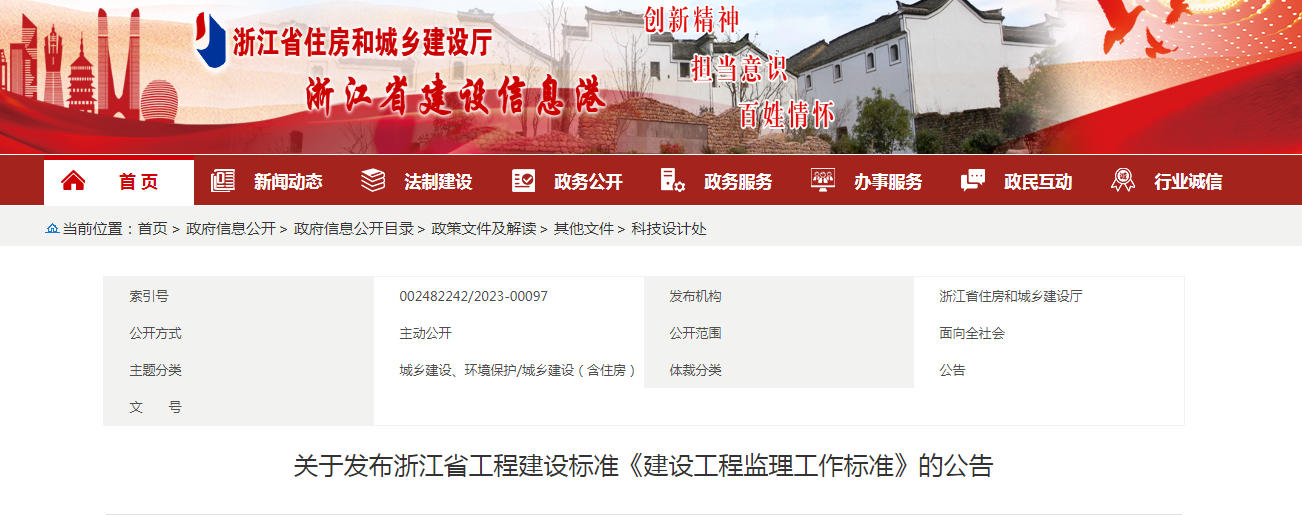 現(xiàn)批準《建設(shè)工程監(jiān)理工作標準》為浙江省工程建設(shè)標準,編號為DBJ33/T 1104-2022,自2023年3月1日起施行。原《建設(shè)工程監(jiān)理工作標準》(DBJ33/T 1104-2014)同時廢止。