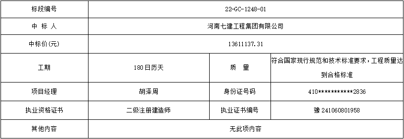 經招標人確定,現將該項目鄭州市管城回族區建武路(天福路-潯江西路)道路工程項目(標段編號:22-GC-1248-01)的中標結果公告如下: